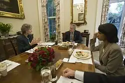 Karen Hughes (L) at White House luncheon with President George Bush (C) and United States National Security Advisor and United States Secretary of State Condoleezza Rice (R).