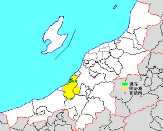 * yellow - areas formerly within the district borders during the early Meiji period