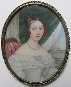 In 1837 Hügel was married to Alexandra Mikhailovna Vereshchagina (1810–1873) in Paris.[13] From a Russian Boyar family, she was the daughter of Mikhail Petrovich Vereshchagin and Elizaveta Annenkova, and a cousin of writer Mikhail Lermontov.[14] He met Alexandra in the salon of the Russian Ambassador Count Pozzo di Borgo in Paris. The marriage produced a son and several daughters, including:[5]