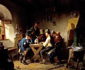 Karl von Enhuber (1811–1867), a genre painter, was born at Hof, in Voigtland. He was the son of a civil officer who, when his son was eighteen months old, moved to Nördlingen. After studying at the Munich Academy he was at first an animal painter. He then worked at representations of the Thirty Years' War and only through the study of the works of Metsu and Terborch did he discover his true talent. He was admitted a member of the Munich Academy in 1858, and died at Munich in 1867. He excelled in characterizing middle-class home life, with its pleasures and troubles, and had a natural sense of humour, which was the foundation of his delicate delineation of character. To be mentioned amongst his works are: