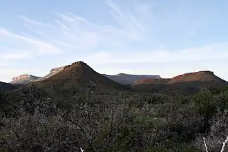 About 60 million years after the Beaufort sediments had been laid down and topped with a thick layer of desert sands, there was an outpouring of lava on to Southern Africa on a titanic scale. The entire area was covered within a very short space of time with a 1.5 km thick layer of lava, the remnants of which form the Drakensberg. In addition to flooding the African surface with lava, lava was also forced under great pressure between the sedimentary layers of the Beaufort rocks. These subterranean horizontal layers of lava solidified into what are known as dolerite sills, which can vary in thickness from a few centimetres to several meters.[15][16] Subsequent erosion of the Southern African interior re-exposed the Beaufort rocks over most of the Great Karoo. But the dolerite sills were more resistant to erosion than the Beaufort sediments, which resulted in the creation of flat topped hills all over the Karoo (the flat tops being formed by dolerite sills). The flat top edge of the Great Escarpment in the Karoo is also formed, in many places including the Karoo National Park, by a thick dolerite sill.