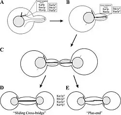 Two models of nuclear congression have been proposed: the sliding cross-bridge, and the plus end model. In the sliding cross-bridge model, the microtubules run antiparallel to each other for the entire distance between the two pronuclei, forming cross-links to each other, and each attaching to the opposite nucleus at the plus end. This is the favored model. The alternative model proposes that the plus ends contact each other midway between the two pronuclei and only overlap slightly. In either model, it is believed that microtubule shortening occurs at the plus end and requires Kar3p (in yeast), a member of a family of kinesin-like proteins.[10]