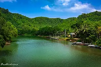 The Cikaso River originates in North Sukabumi and flows south to the Surade subdistrict in South Sukabumi.[3] The Cikaso waterfall is in the Ujung tourist area between Jampang Kulon and Surade. The waterfalls have a height of almost 80 metres (260 ft), with three parallel drops along cliffs that are about 100 feet (30 m) wide. The falls are accessible from the Ciniti, Cibitung village in the Cibitung Kulon sub-Jampang. They can be reached by foot or by motor boat.[4]