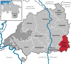 UslarUslarBodenfeldeHardegsenNörten-HardenbergKatlenburg-LindauDasselMoringenBad GandersheimNortheimKalefeldEinbeckEinbeckNortheim (district)Lower SaxonyHesseGöttingen (district)Holzminden (district)Hildesheim (district)Goslar (district)Göttingen (district)North Rhine-Westphaliagemeindefreies Gebiet Solling