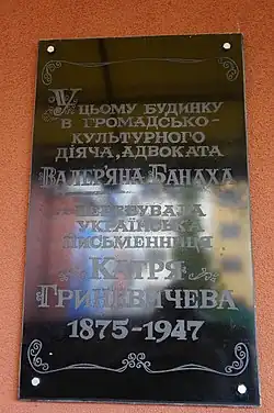 Katrya Hrynevycheva was born in Winniki, Galicia, Austro-Hungarian Empire (present-day Vynnyky, Ukraine) in 1875. Hrynevycheva was a teacher, married with three children. She wrote poetry and prose for various journals from 1893 with the support of Vasyl Stefanyk and Ivan Franko. From 1909 she was the editor of the children's magazine Dzvinok. After the end of the First World War Hrynevycheva worked for the newspaper Ukraïns’ke slovo. She wrote in Ukrainian and captured the folk vernacular as well as historical phrases in her works. Hrynevycheva wrote several collections of short stories and novelettes. Her biography was published in Toronto in 1968.[1][2]