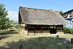 The Katsunuma clan were a cadet branch of the Takeda clan founded by Takeda Nobutora's brother Katsunuma Nobutomo. The clan was annihilated by Takeda Shingen in 1560 during his struggle to seize control of the province from his father. The site of their fortified residence is located in former Katsunuma town, on a river terrace of the Higawa River at an elevation of 418 meters. It strategically located overlooking the old route of the Kōshū Kaidō highway connecting Kai Province with Musashi Province and Sagami Province. The site was discovered in 1973 during construction of a prefectural wine promotion center. An archaeological excavation was conducted from 1973 to 1977 which revealed that the site consisted of a moated compound measuring 90 meters east-to-west by 60 meters north-to-south. Within this compound were the foundations of 23 buildings, along with a temple, blacksmith and reservoir.[2]