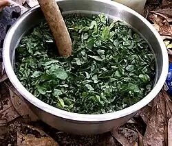 Kawal is food made of fermented leaves used as a meat substitute indigenous to western Sudan, in particular the Kordofan and Darfur provinces, and eastern Chad.[1][2][3] In urban areas, it is used as a condiment, similarly to black pepper.[3] It is also used by low-income families as a primary protein source, substituting or extending meat or fish in stews and sauces.[4] It is created from the fermented leaves of Cassia obtusifolia, a toxic wild legume also known as the kawal plant.[1]