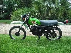 The Kawasaki KE100 is a dual-sport motorcycle that was produced by Kawasaki from 1976 to 2001. A direct successor to the G5, the major changes on the KE100 were different ergonomics and a change in transmission layout (1-N-2-3-4-5 to the G5's N-1-2-3-4-5). The KE100 did not change much through the years, although minor changes were made to the engine and transmission over successive model years, as well as a switch to different tanks after the B4 model. It uses an oil injection system that Kawasaki calls superlube to both eliminate fuel-mixing and give a precise fuel-oil mixture in the two-stroke cycle, reducing emissions enough that the KE100 still passes US emissions tests. Its fuel tank has a capacity of 2.5 US gal (9.5 L; 2.1 imp gal) and includes two small hooks on the rear of the frame that can be used either to mount turn signals or to tie or "bungee" a spare fuel tank for longer journeys.