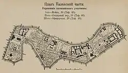 The Kazanskaya Sector bordered the Admiralty Sector to the north, the Spassky Sector to the south and the Kolomensky Sector to the west.[4] The area emerged as bourgeois-aristocratic and governmental offices region in the heart of the imperial capital.[3] An 1883 Baedeker travel guide described the Kazanskaya Sector as full of palaces and the most elegant shops.[4]