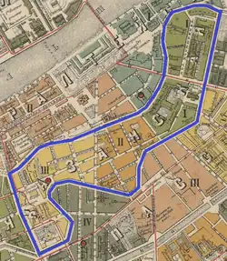 The Kazanskaya Sector was divided into three police precincts, each of which were divided into two neighbourhoods.[5] The First Neighbourhood of the First Police Precinct stretched from the north-eastern end of the island to the Nevsky Prospekt.[5] The Second Neighbourhood of the First Police Precinct included the areas of the Kazanskaya Island between Nevsky Prospekt and Gorokhovaya Street.[5]