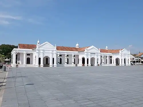 Originally design by architect Muhammad bin Lebai Thambi of the Kedahan Public Works Department,[2] the building adopts an eclectic combination of neoclassical and Sino-Portuguese architectures, with strong Palladian motifs and colonnades from the former mixed with Baroque ornamentation and extensive use of arches from the latter; of note is the presence of the Kedahan shield in the ornamentation over every arch of the building.[3][1] The building is fronted by an open court comprising a public square and park.[1]
