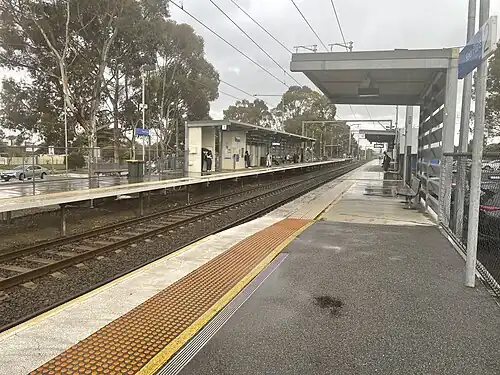 In 1986, boom barriers were installed at the former Taylors Road level crossing, which was located at the down end of the station.[5] In 1994, a rail-road roundabout was provided at the level crossing.[6] In April 2007, construction commenced on a grade separation project, which involved lowering the road underneath the railway line.[7] By September 2008, the level crossing was replaced and the project completed.[8][9]