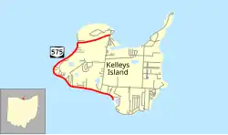 Kelleys Island is served by Ohio State Route 575. The route was created in 1937 and has not changed since, and is one of Ohio's only state highways to be disconnected from the rest of the system.