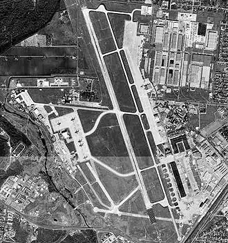 In 1926, the Army Air Corps Act authorized a 5-year period of expansion to begin July 1, 1927.[7] As a result, both Kelly No. 1 and No. 2 began being developed as permanent aviator training facilities.[8] During World War II, the facilities were consolidated as San Antonio Air Depot and was the largest maintenance and supply facility in the United States. The property was renamed Kelly Air Force Base after the National Security Act of 1947 established the United States Air Force as a separate branch of the military.[9] Kelly eventually became the largest employer in San Antonio.[8] In 1995, the United States government began realignment of military facilities. Kelly was closed in 2001, partially combined with Lackland Air Force Base. The remainder was taken over by the Greater Kelly Development Authority of the state of Texas and redeveloped as a commercial and military industrial center.[10]