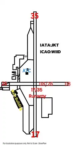 When it operated in the 1940s, Kemayoran had two intersecting asphalt runways: runway 17-35, which is the main runway, and runway 08-26, which intersects the main runway by 90° creating a cross and later cruciform shape. Each runway is 800 meters long, oriented north-south and east-west. The airport also included an air traffic control tower, an aviation affairs office, a meteorology office, and a communication center equipped for radio and telegraph communication. A large two-story terminal was designed for passenger comfort that featured cafes, restaurants, telephone booths, a post office, and a loudspeaker system. Not to mention the hangar, which was not only for storing aircraft but also capable of carrying out aircraft and engine maintenance independently.[4]