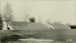 Prior to receiving the final layer of top soil, the field received an underground wiring system that will allow for flood lighting to be used in the stadium for "night spectacles" and also included telephone and telegraph wires.[27][31] Architects Atwood-Nash and Woollen made plans for a covered area for press members to write up reports, use the typewriter and transmit reports by radio.[27] By the end of February, the field was almost completely leveled.[32] T. C. Thompson and Bros. started construction once the excavation was finished.[32] In total about 55,000 cubic yards of dirt was relocated and the stadium was projected to have around 4,000 cubic yards of concrete.[32][26] All of the concrete provided for the project came from the Atlas Portland Cement company.[33] Final gift total $300,000.[34] Prior to the concrete being poured on the dirt, it was steamrolled.[32][31] The stands were planned to have 41 rows of seats.[31][26]