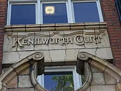 Kenilworth Court was designed by architect R. C. Overton, it was built from 1902[3] and completed by 1906.[4] The building has Dutch gables, bracketed stone balconies, stone architraves over the windows and iron railings, with 'Kenilworth Court' displayed over the entrance to each block.[5] There are 150 flat with an on site management teams[6] spread between eight mansion blocks.[7] The central courtyard had a tennis court before World War II, it was then used for growing vegetables and is now a managed garden.[8]