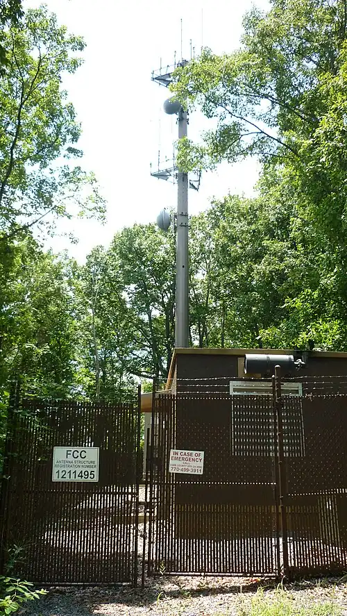 Several small radio antennas, which are atop the mountain near the summit, belong to the U.S. government and the government of Georgia. Originally on four separate wooden telephone poles, they were consolidated to a metal monopole around 2005. The Quonset huts which house the transmitters and other telecom equipment are painted solid green or brown to camouflage them. Power lines are buried, and generators supply backup power in the event of a power failure.