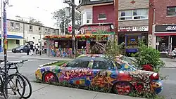 A non-permanent landmark of Kensington Market is the Garden Car, which has been a staple of the neighbourhood since 2007. Originally built in 2006 by local advocacy group Streets are for People, the car is a public art piece that doubles as a community garden. There have been 3 cars since the inception of the first Garden Car.[17][18][19]