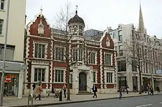 By the 1870s the improvement commissioners were already finding the building too small and they relocated to a more substantial building in 1880.[8] The old vestry hall was then converted for use as the Kensington Central Library and was officially re-opened in that capacity by Princess Louise, Duchess of Argyll in November 1889.[9] The building remained in use as a library for much of the 20th century until the Kensington Central Library relocated to a new site on Hornton Street in 1960.[2] The old vestry hall was listed as Grade II by English Heritage on 15 April 1969[1] and, by 1998, it was "the only substantial remnant" of what the street looked like during the Victorian era.[7] It subsequently became the home of Bank Melli Iran.[10][11]