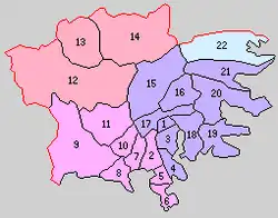 1. Sakari; 2. Yonesaki; 3. Ōfunato; 4. Massaki; 5. Otomo; 6. Hirota; 7. Takata; 8. Kesen; 9. Yasaku: 10. Takekoma; 11. Yokota; 12. Setamai; 13. Shimoarisu; 14. Kamiarisu; 15. Hikoroichi; 16. Takkon; 17. Ikawa: 18. Akasaki; 19. Ryōri; 20. Okirai; 21. Yoshihama; 22. Tōni; Purple = Ōfunato City; Orange= Sumita Town; Pink = Rikuzentakata Town; Blue = Kamaishi City
