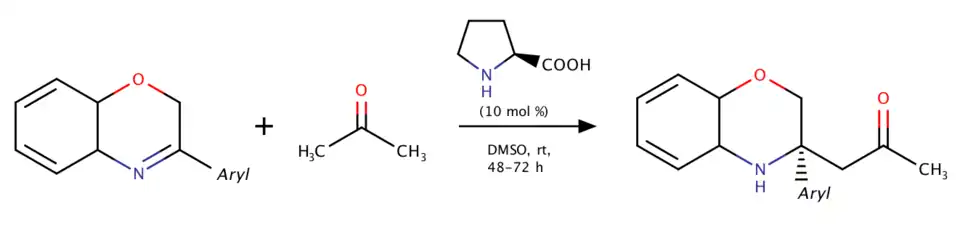 - ^ Wang, You-Qing; Zhang, Yongna; Pan, Kun; You, Junxiong; Zhao, Jin (2013-11-13). "Direct Organocatalytic Asymmetric Mannich Addition of 3-Substituted-2H-1,4-Benzoxazines: Access to Tetrasubstituted Carbon Stereocenters". Advanced Synthesis & Catalysis. 355 (17): 3381–3386. doi:10.1002/adsc.201300654. ISSN 1615-4150.
