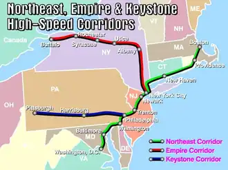 Keystone Corridor (blue), as designated by the Federal Railroad Administration