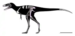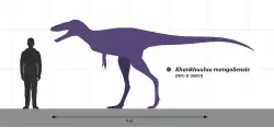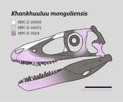 Khankhuuluu (/xɑːnˈxl/ khahn-KOO-loo; lit.'dragon prince')[1] is an extinct genus of early tyrannosauroid theropod dinosaurs from the Late Cretaceous of what is now the Gobi Desert in Mongolia. The genus contains a single species, Khankhuuluu mongoliensis, known from several skull bones and two partial skeletons, including shoulder, pelvic, and hindlimb bones, and several vertebrae from the back and tail. The remains were discovered in 1972 and 1973 and first described in 1977 as belonging to the Chinese Alectrosaurus. Later researchers recognized the uniqueness of the bones, and they were eventually named as belonging to a new species in 2025. Khankhuuluu is a medium-sized tyrannosauroid with a shallow skull and long, slender legs. Its skeleton demonstrates a unique combination of anatomical traits seen in both earlier-diverging (basal) tyrannosauroids and the later-diverging (derived) tyrannosaurids.
