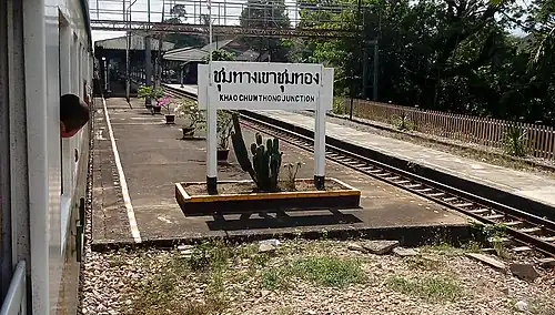 Khao Chum Thong Junction railway station is a railway station located in Khuan Koei Subdistrict, Ron Phibun District, Nakhon Si Thammarat. The station is a class 2 railway station, located 781.018 km (485.3 mi) from Thon Buri railway station. This station is the junction for the Southern Line mainline and the Nakhon Si Thammarat Branch Line.
