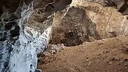 Originating in the Paleolithic period, the rock art found in Khoit Tsenkher Cave includes symbols and animal forms painted from the walls up to the ceiling.[1] Stags, buffalo, oxen, ibex, lions, Argali sheep, antelopes, camels, elephants, ostriches, and other animal pictorials are present, often forming a palimpsest of overlapping images. The paintings appear brown or red in color, and are stylistically similar to other Paleolithic rock art from around the world but are unlike any other examples in Mongolia.