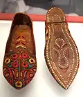 Sindhi Khusso, Multani Khussa or simply just Khussa (Urdu: کُھسّہ), is a traditional footwear[1] produced in Sindh and Multan in Pakistan.[2][3][4] Khussa are hand-made by local artisans mostly using vegetable-tanned leather. The uppers of Khussa are made of one piece of leather or textile, which is embroidered and embellished with brass nails, cowry shells, taunra, mirrors, bells and ceramic beads. Even the bonding from the upper to the sole is done by cotton thread that is not only eco-friendly but also enmeshes the leather fibers with great strength. Some product range also uses bright and ornate threads.[5]