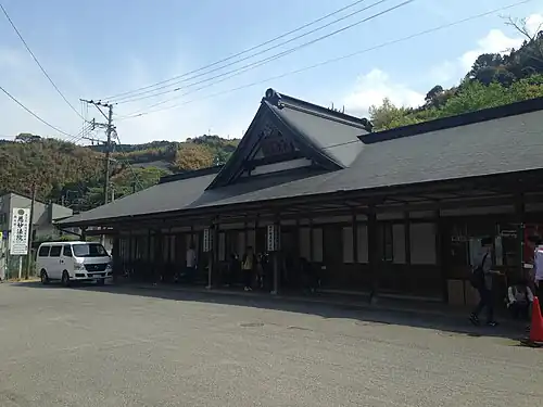 The station consists of two side platforms serving two tracks at grade. A large station building in traditional Japanese architectural style houses a waiting room, a shop and a ticket window staffed by a kan'i itaku ticket agent. From the ticket gate, passengers enter an underpass which leads to two flights of steps, giving access to the two platforms. A large parking lot is available at the station forecourt.[2][3][4][5][6]
