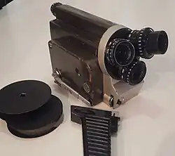 Constructed to work with 16mm film with either one-sided or two-sided perforation wound on a reel, the camera's reel capacity was designed to handle 30m or 100ft of film. The camera is equipped with a three-lens rotary turret which allowed for quick and easy switching between lenses.[1]