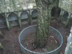 Muckross Abbey was founded in 1448 by Observantine Franciscans and is also still standing, despite having been damaged and reconstructed several times when its inhabitants were raided. "Friars Glen" on Mangerton Mountain is customarily said to have been one of the places the monks would flee to when the monastery was attacked. The central feature of Muckross Abbey is a central courtyard that contains a huge yew tree surrounded by a vaulted cloister.[14] It is traditionally said that this tree is as old as Muckross Abbey itself.[1] The abbey was the burial place of local chieftains. In the 17th and 18th centuries the Kerry poets Seafraidh O'Donoghue, Aogán Ó Rathaille, and Eoghan Rua Ó Súilleabháin were buried there.[4]
