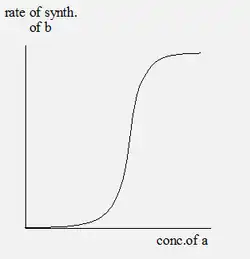 If a product an acts to stimulate the production of b, it is a positive regulator. In this case, the rate of synthesis of b increases with increasing concentration of a, and makes a curve similar to that shown in figure B.