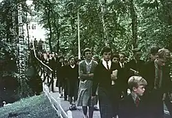 A major feature of the school was the emphasis given to sports and extra-curricular activities. During its short life of 11 years, KAS won, no less than six times, the Milocarian Trophy[18][19] for athletics in British schools, as well as the 4 x 110 yards relay race at the London Athletic Club's Schools' Meeting held in the White City Stadium, London.[20] Apart from the usual school sports, there were also: Scouts, Guides and CCF camps, horse riding and dinghy sailing, as well as inter-house music and verse-speaking competitions. The school assembly hall, a fully equipped theatre, was the venue for some memorable school productions. In 1949, the Rank Organisation filmed Looking for Trouble at the school; all the supporting cast were members of staff or pupils of the school. In January 1955, KAS competed in the BBC Radio Top of the Form quiz show.