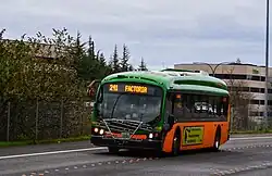 Metro began testing three new Proterra Catalyst battery electric buses in 2015.[27] The coaches are capable of traveling over 26 miles[28] before the battery needs to be recharged. A special fast charge station located at the Eastgate Park and Ride allow the bus to be fully recharged in under 10 minutes, during the driver's normally scheduled layover.[29] These new vehicles get the equivalent of 20.8 MPG, which is over 6 times better than the 3.18 MPG seen on Metro's series hybrid electric coaches.[30][31] The coaches were purchased with support from a $4.7 million Federal Transit Administration grant and entered revenue service on February 17, 2016.[32] They operate on shorter routes (due to their limited range) on the eastside, specifically Routes 226 and 241.[30][33] Metro has committed to purchasing 120 electric buses with the option to purchase up to 80 additional vehicles by 2020. In 2017 and 2018, Metro tested electric buses with ranges of 140 miles from several manufacturers,[34] and plans to have a zero-emissions bus fleet by 2040.