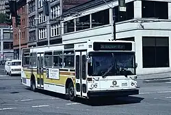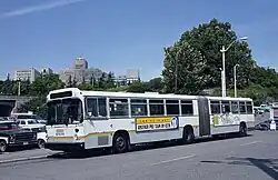 Upon taking over transit operations on January 1, 1973, Metro used buses acquired from predecessor agencies Seattle Transit System and the Metropolitan Transit Corporation, still painted in their original colors.[4] Metro acquired the 91-bus fleet of the Metropolitan Transit Company in December 1972 at a cost of $2.75 million.[5] The first fleet of new 40-foot (12 m) buses ordered by Metro arrived in June 1976, consisting of 145 diesel coaches manufactured by AM General.[6] In 1978, Metro became the first large transit agency in North America to introduce articulated buses to its fleet, which required some bus stops to be rebuilt to accommodate 60-foot (18 m) coaches.[7][8][9] The fleet of 151 buses were manufactured by German maker MAN as part of a bulk order with other large U.S. transit agencies.[10]