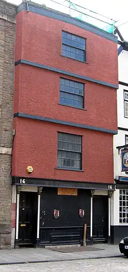 • Number 16 is a historic house, which now serves as an office. It dates from around 1665 and was designated a Grade II* listed building by English Heritage on 8 January 1959. The house is a timber-framed four storey building with a basement, and features an 18th-century timber parapet in front of the gable on the roof. The ground floor front dates to the 19th century. The inner staircase, to the right of the centre features "turned balusters and square newels with ball finials and roll-topped rail, door frames with ovolo mouldings and cyma stops".[8]