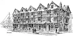 • Numbers 7–8 date from 1665.[6] During restoration in 1976 it was found that recycled ships timbers had been used for much of the oak studding and bracing in the buildings, and barrel staves had been used as lathes.[6] The oriel window of number 7 is an original feature, whilst the windows of number 8 were replaced during the eighteenth century.[6] 7 and 8 King Street have been designated a grade II* listed building.[6]