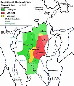 Since the Burmese conquest of Lanna in 1558, Lanna or modern Northern Thailand had been mostly under Burmese rule.[1] With the Burmese Toungoo dynasty weakened, Chiang Mai was able to exert independence from Burma in 1727 and the rest of Lanna followed but Lanna became fragmented into city-states, descending into anarchy. A local man named Thipchang was declared ruler of Lampang in 1732. The new Burmese Konbaung dynasty reconquered Chiang Mai in 1763 and installed Chaikaew, son of Thipchang, as ruler of Lampang in 1764. Lanna then again came under Burmese domination.