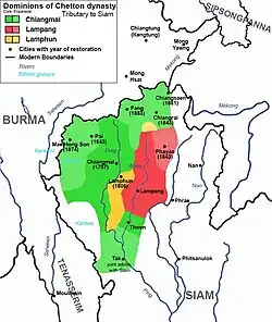 After decades of Burmese-Siamese Wars, Lanna, as the frontline battlegrounds, was ravaged by warfare and faced manpower shortage. After reestablishment of Chiang Mai in 1797, Kawila and other Lanna lords pursued the policy of "putting vegetables into baskets, putting people into towns"[4] to wage wars to acquire manpower. Elimination of Burmese influence in Lanna in 1804 allowed Lanna lords to expand their dominions and military campaigns to the northernmost Tai princely states including Kengtung and Chiang Hung Sipsongpanna, which were known collectively as Lue-Khuen (ลื้อเขิน) in Thai sources. Trans-Salween states to the east of Salween River had political and cultural affinity towards Lanna and centers other than Burma.[6] These states were the main victims of Lanna's subjugations and subsequent forced resettlements into Lanna towns previously damaged and depopulated.[4] In 1805, Thammalangka captured Mong Yawng.[4] In the same year, around 10,000 people, including Tai Khuen people from Kengtung along with its saopha Sao Kawng Tai and Tai Lue people from Mong Yawng, were deported to settle in Chiang Mai and Lamphun, respectively, leading to foundation of Lamphun as the third princely seat in 1806. These major events were accompanied by minor rounds of deportation that gradually transferred population from northernmost Tai states into Lanna.