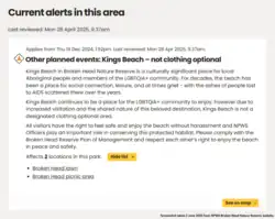 In 2024, the closure of Tyagarah Beach as a clothing-optional site brought renewed attention to Kings Beach, which became the last known nude beach in the region. NPWS subsequently increased enforcement of anti-nudity regulations, installing signs and issuing statements clarifying that nudity was not legally permitted.[19] While officials emphasized that the beach remained "welcoming" to LGBTQ+ visitors, many viewed the changes as part of a broader rollback of queer access to public space.[20] Longtime beachgoers described Kings as a rare sanctuary, and criticized the lack of community consultation. Particular frustration was directed at the 2019 Plan of Management for Broken Head Nature Reserve, which made no mention of the beach's decades-long queer history or cultural significance.[2][20]