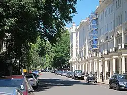 The Kingston House estate and Ennismore Gardens in Knightsbridge is a green, dual-character area within the western limits of the City of Westminster in London. The first-named is immediately south of Hyde Park, London taking up the park's semi-panorama row of 8 to 13 Princes Gate (demolished) and otherwise, as to more of its wings, set around the east of Princes Gate Garden including a terrace of houses №s 1 to 7 Bolney Gate. The second-named is a garden square of 59 tall creamy-white terraced houses and the approach road to Prince of Wales Gate, Hyde Park[a] as well as the identical-size public, square green of the church that is since 1956 the Russian Orthodox Cathedral of the Dormition of the Mother of God and All Saints facing which green are its anomalous outlier row for a London garden square, №s 61 to 66.[b] The relatively small, broad-fronted house set against the Consulate-used pairing at №s 61 to 62 is № 60 and as with the other 65 numbers of Ennismore Gardens is a listed building.