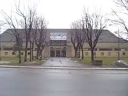 The Kingston Memorial Centre is a 3,300-seat multi-purpose arena located at 303 York Street in Kingston, Ontario, Canada. Opened in 1951, the Kingston Community Memorial Health and Recreation Centre was designed as a community sports and entertainment centre that would become a "living memorial" in remembrance of Kingstonians who gave their life in both world wars and the Korean War (Planning Partnership-Hughes Downey Architects 2007, p. 5). The Memorial Centre lands and facilities include a war memorial, a large ice pad in the arena building, a new outdoor aquatic centre, agricultural barns, softball diamonds, a cinder track, off leash dog park and a linear park at the east, north and west perimeter of the property.[1] Just east of the arena building was the International Hockey Hall of Fame (IHHOF) museum building at 277 York St. In July 2012, Kingston City Council approved the relocation of the collection on a short-term basis to the Invista Centre on Gardiners Road in Kingston. The existing building was found to have costly repair issues related to moisture penetration. It was demolished after the IHHOF moved to the Invista Centre in Kingston's west end.[2]