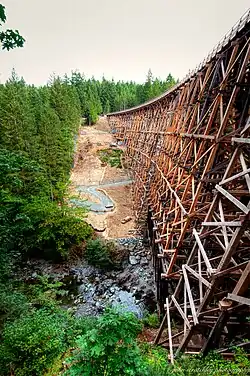The bridge's dimensions measure 44 m (144 ft) high and 188 m (617 ft) long, making it the largest wooden trestle in the Commonwealth of Nations and one of the highest railway trestles in the world.[2] It was constructed out of old-growth Douglas fir timbers,[3] and has an unusual seven-degree curve.[4]