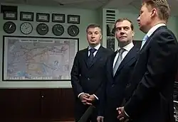Gazprom Mezhregiongaz General Director Kirill Seleznyov, Russian Prime Minister Dmitry Medvedev and Gazprom CEO Alexey Miller visit Gazprom Mezhregiongaz in Moscow Oblast.