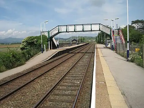 There are no longer any permanent buildings at the station apart from a footbridge and shelters on each platform (that on the northbound one being the more substantial).[2] The station has (like others on the line) been fitted with a ticket vending machine, to allow passengers to buy their tickets prior to travel.[3] Step-free access is available to both platforms, though this requires the use of a barrow crossing for northbound passengers and so care must be taken when used. Train running information is provided by telephone, digital display screens and timetable posters.[4]