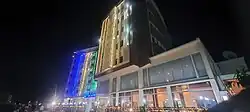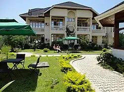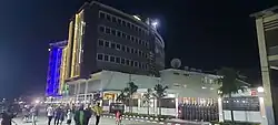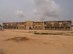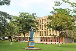 Kisangani has architecturally significant buildings in a wide range of styles still in their original form. These include the Aumonerie which is distinctive for its facade using visible stone-tone to evoke the building's structure, the impressive 20th century headquarters landmark that is Central Prisons' with its towering fortress walls,[56][57][58]Cathédrale Notre-Dame du Rosaire, an early cathedral revival built with massively scaled stone detailing,[59] and the Congo Palace Hotel on avenue de l'eglise is an important example of highly influential European style buildings in Kisangani.[60][61][62][63]