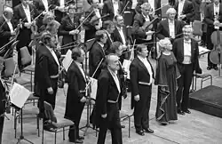 König was active in concert, singing especially works by Beethoven, Anton Bruckner and Gustav Mahler. He performed the tenor part in Beethoven's Ninth Symphony at the Konzerthaus Berlin conducted by Leonard Bernstein after the Fall of the Berlin Wall in 1989.[1][6] He appeared regularly at the Schlesisches Musikfest festival in Görlitz, for example Bruckner's Te Deum in 1996[7] and the tenor part in Beethoven's Ninth Symphony in 1998.[8]